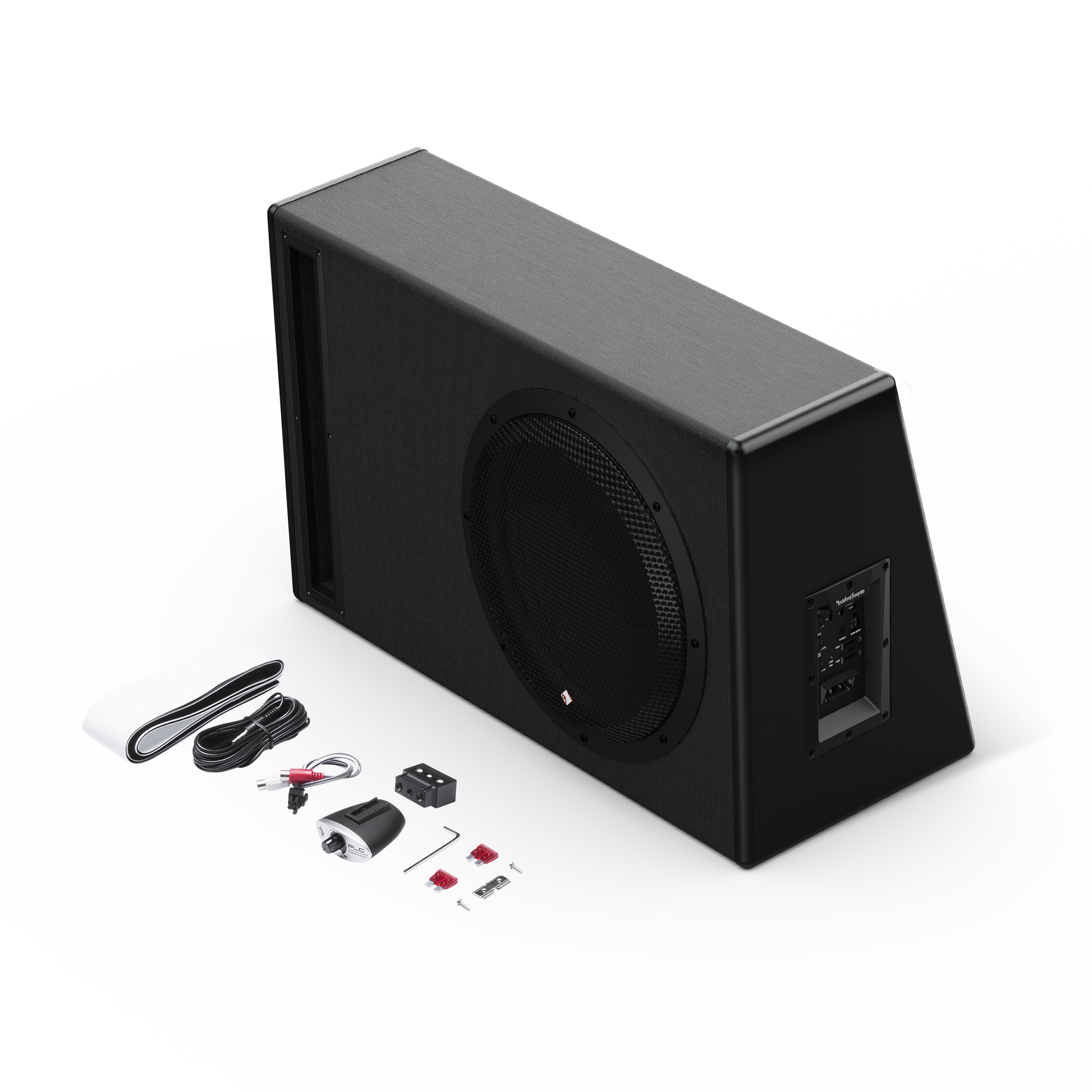 The Punch 500-12P is a self-contained subwoofer enclosure with built-in amplifier. This "all in one" solution is great for systems that need extra Punch on the low-end of the frequency spectrum. The 12" high output subwoofer is impedance optimized for the built in 500-watt class-D amplifier that features a low-pass crossover, bass EQ and phase switch. You can change the amount of bass on the fly with the included remote level control. The slot port provides powerful output at lower frequencies for enhanced bass reproduction. The enclosure can be connected via speaker level inputs for connection to factory systems, or traditional line level inputs for aftermarket systems. It also features an intelligent auto turn-of/off circuit that eliminates the need for a separate turn-on wire. The enclosure itself is precision designed and constructed using MDF (Medium Density Fiberboard) for the best acoustical properties and covered with heat activated vinyl finish to resist marks. The enclosure also features a quick-release connectors for easy removal when you need extra cargo space.